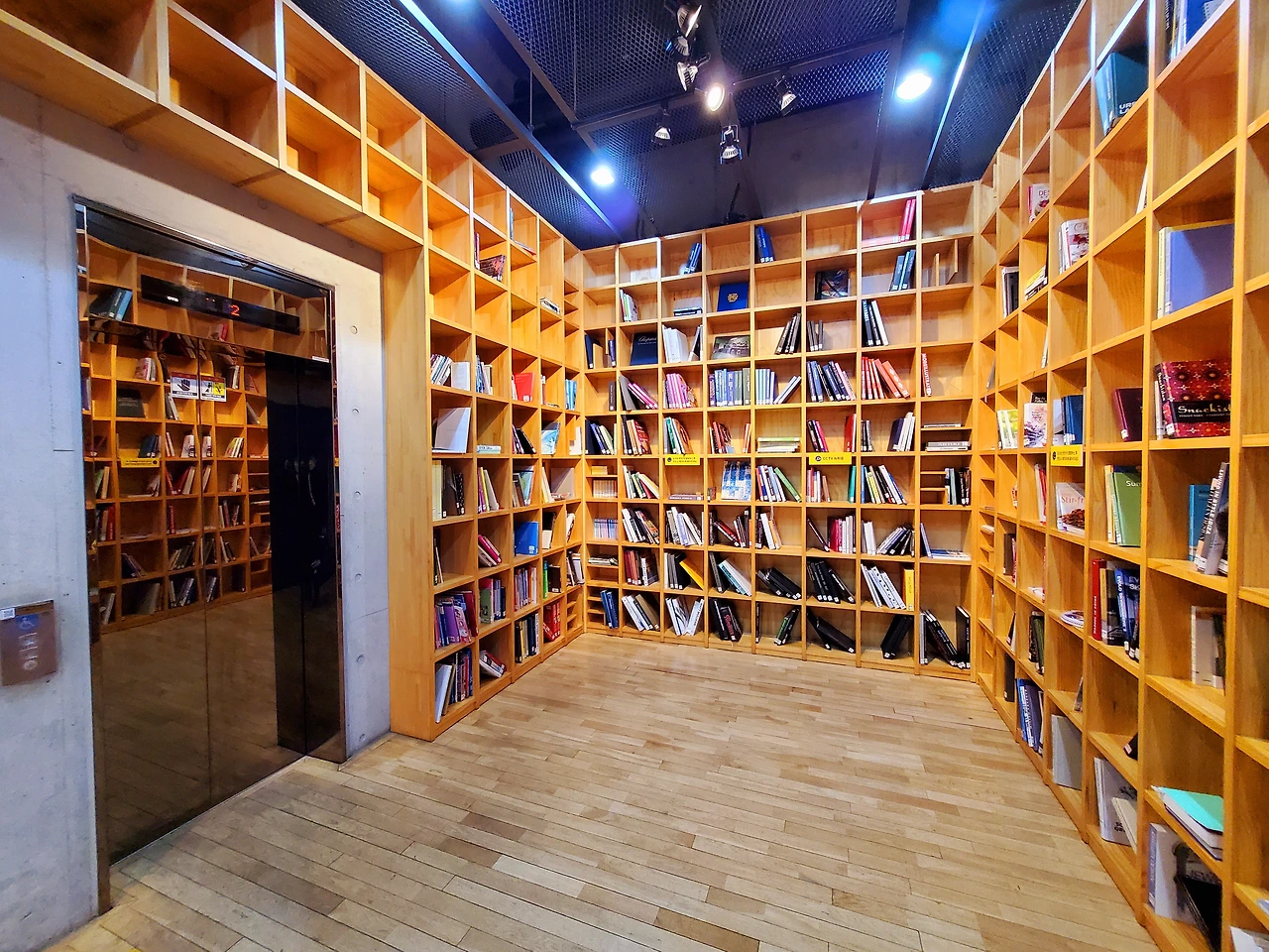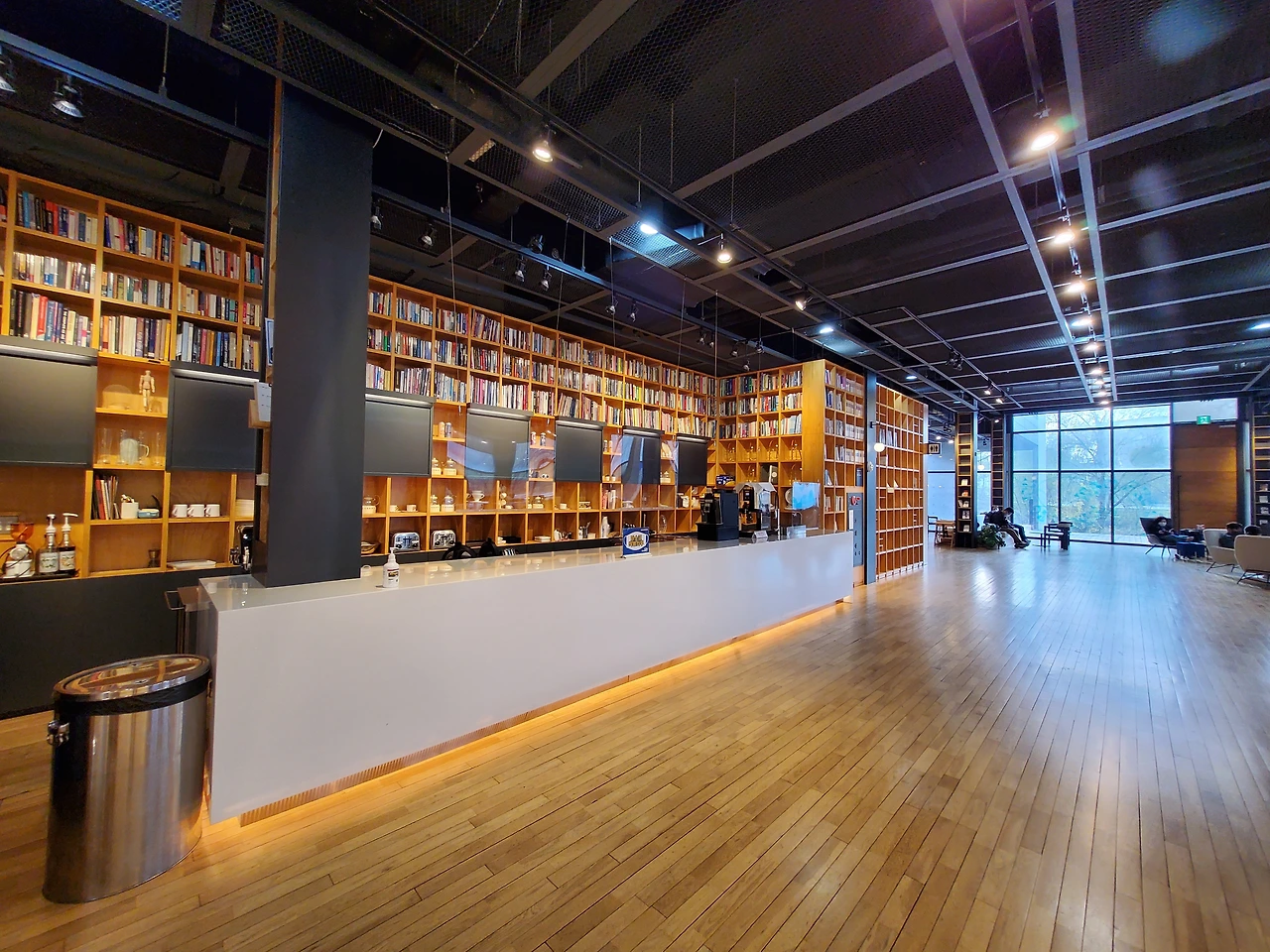 더 많은 책을 보고 싶다면 지지향 라운지 문을 열고 나가서 우측으로 1분(?)만 걸으면 바로 지혜의 숲이라 명명된 거대한 책으로 둘러싸인 카페가 나온다.