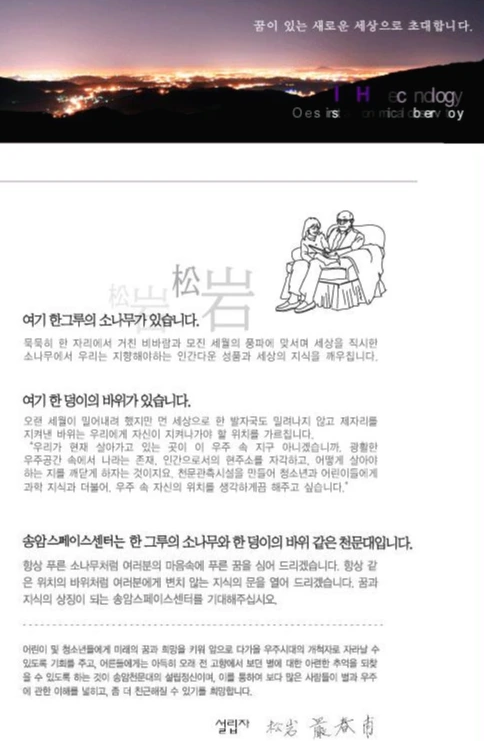 서울 중심에서 약 20km 남짓한 곳에 있는 송암스페이스센터는 한일철강 회장을 지낸 송암 엄춘보 선생이 400억 원의 사재를 들여 만든 사설 천문대다. 송암스페이스센터는 천문과학 교육장인 스페이스센터와 해발 443m의 계명산 형제봉 정상에 자리 잡고 있는 천문대로 이루어져 있다. 스페이스센터에는 사계절의 신비한 밤하늘 별자리를 생생한 입체 영상으로 감상할 수 있는 ‘디지털 플라네타리움’과 미 항공우주국의 전직 우주 조종사들의 참여로 만들어진 우주학습공간 ‘챌린저 러닝센터’ 등을 갖추고 있다. 천문대는 스페이스센터에서 케이블카를 타고 올라가야 한다. 그곳에서는 국내 기술로 만든 첫 번째 60㎝ 리치크레티앙식 망원경을 비롯 반사식, 반사굴절식, 굴절식 등 다양한 성능의 망원경으로 먼 우주에서 반짝이는 별들을 만날 수 있다.