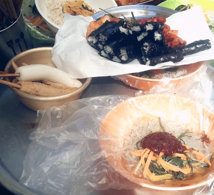 이제 남은 건 아리랑거리 속 음식들이었다. 간식이라 생각하고 '아리랑거리'로 갔다. 할머니가 나를 불렀다. '다 비슷하겠거니'란 생각에 앉아서 주문했다. 충무김밥에 물떡에 비빔당면. TV를 보면 이 정도는 먹어주는 거라고 해서 나도 그렇게 시켰다.