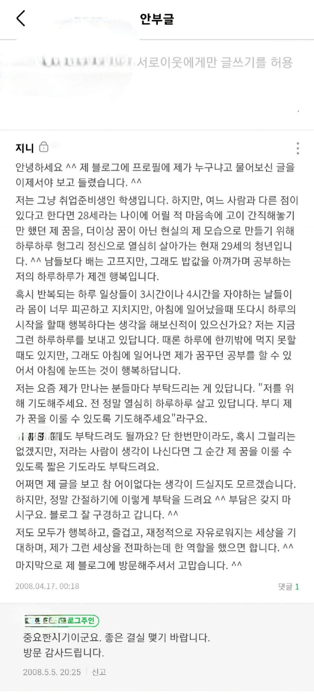 힘들었던 날들이었지만, 그때 그 마음을 기록으로 남겨둔 것이 감사한 마음이다. 이렇게 15년이 지나 지금 내 나이 44살이 되었지만, 이 글 덕택에 난 나의 29살 당시 나의 간절함을 다시 기억할 수 있으니 말이다.