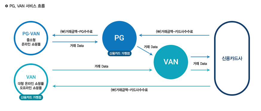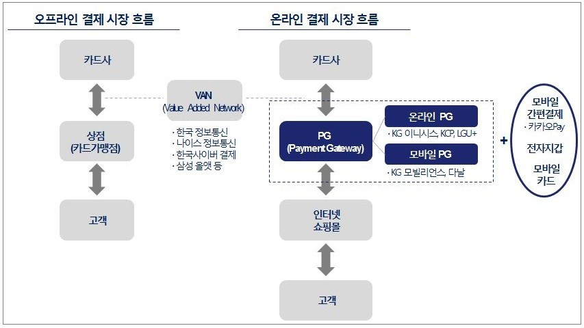 온라인 상점과 신용카드, 은행, 통신과 같은 금융기관과의 거래 결제 대행사 역할