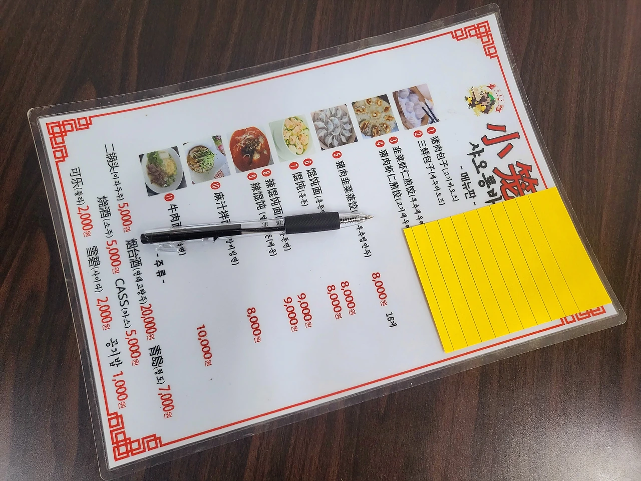 자리에 앉아 메뉴판 위에 있는 포스트잇에 음식 번호와 개수를 적으면 된다.