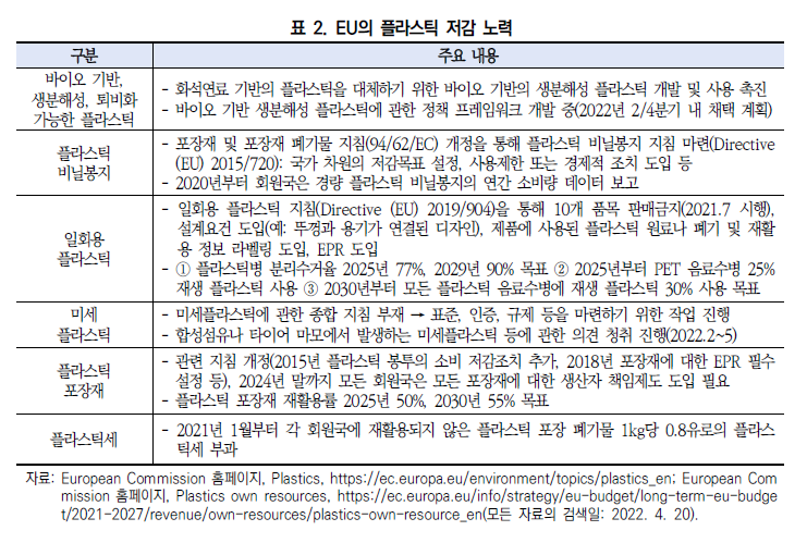 2021년 12월 발표된 ‘한국형(K)-순환경제 이행계획’에는 △석유계 혼합 바이오플라스틱과 순수바이오플라스틱으로의 대체 추진 △플라스틱 제조업체에 대한 재생원료 사용의무 부과 △에코디자인 적용 강화 △친환경 소비 촉진(화장품 리필매장 활성화, 다회용기 사용 문화 조성) △폐자원 회수·고품질 재활용 확대 등의 내용이 포함됐다.