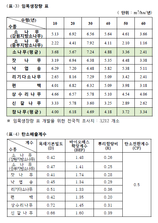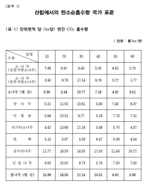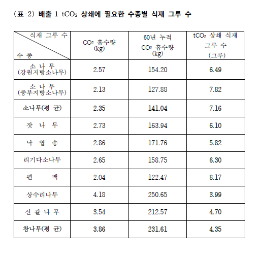 - 1 tCO2 상쇄 소요 식재 소나무 그루 수 : <첨부 1> (표-2)