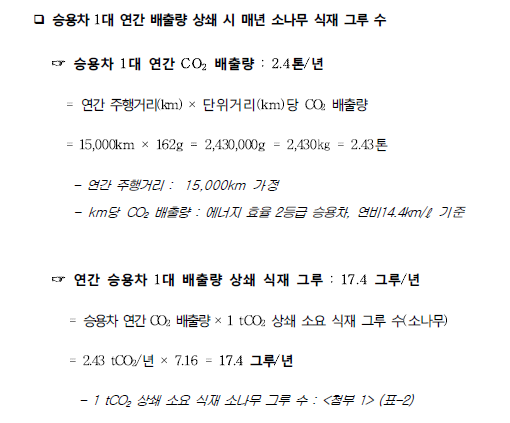 ☞ 승용차 1대 연간 CO2 배출량 : 2.4톤/년