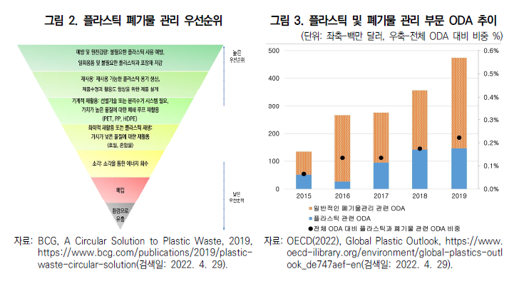 개도국의 플라스틱 문제를 다루는 ODA(A)는 2015년 약 5,100만 달러에서 2019년 1억 4,600만 달러로 늘었고, 폐기물 관리에 관한 ODA(B)도 같은 기간 8,300만 달러에서 3억 2,700만 달러로 크게 늘었으나플라스틱과 폐기물 관리에 대한 ODA를 모두 합쳐도(A+B) 전체의 0.2% 수준에 불과하다.(그림 3 참고)