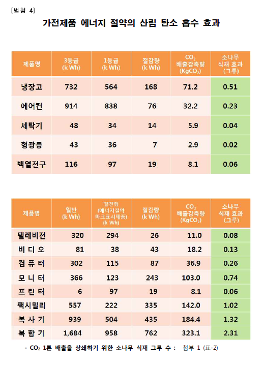 가전제품 에너지 절약의 산림 탄수 흡수 효과