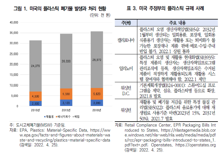 최근 미국은 플라스틱을 포함한 폐기물 처리에 있어 수출이나 매립에 대한 의존도를 낮추고 국내 재활용률을 높이기 위해 관련 인프라 투자를 늘린다는 계획이며, 일회용품 사용 제한이나 생산자책임재활용(EPR)제도를 도입하는 주(州)정부가 늘어나고 있다.
