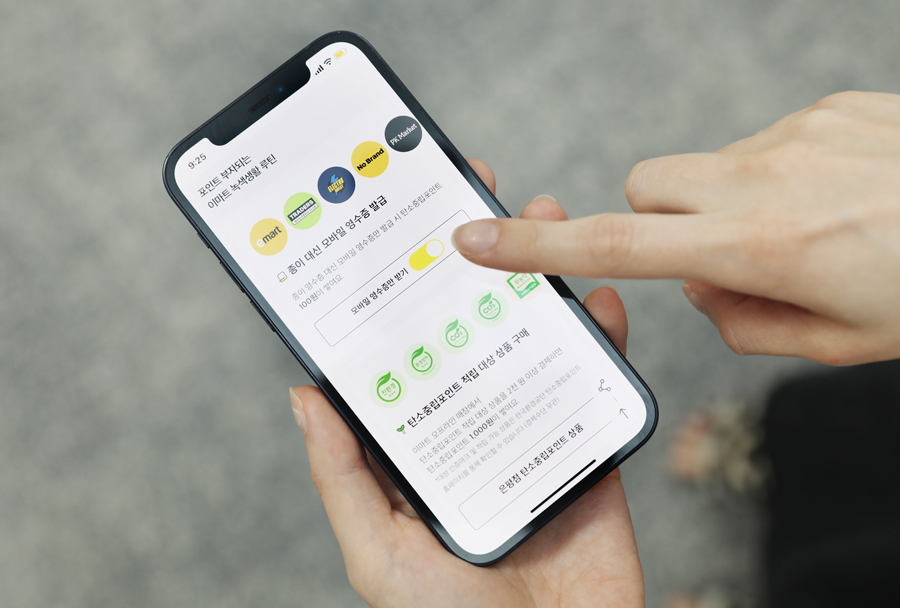 소비자들이 모바일 영수증만 받기 설정을 ‘On’으로 할 경우 모바일 영수증을 발급받을 때마다 100원의 탄소중립포인트가 자동으로 쌓이며, 탄소중립포인트 적립 대상 상품을 2천원 이상 결제하면 포인트 천원이 자동으로 적립된다.