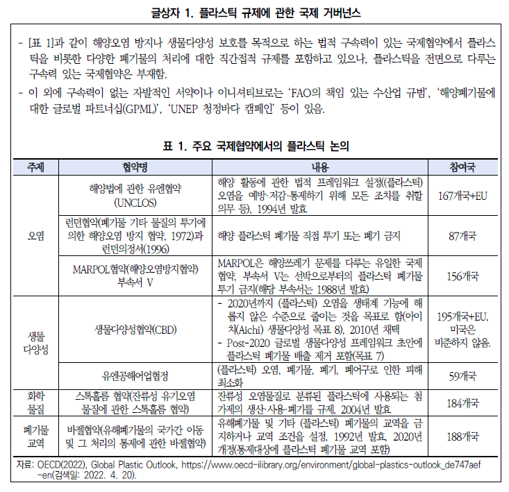 G7, G20, WTO 등 다자협력체와 주요국은 지속가능한 플라스틱 생산과 소비, 재활용률 제고와 폐기물 처리 개선, 해양폐기물 문제 해결 등에 관한 노력을 전개하고 있다.