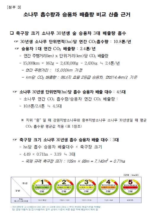 ☞ 축구장 크기 소나무 30년생 흡수 승용차 배출 대수 : 3대