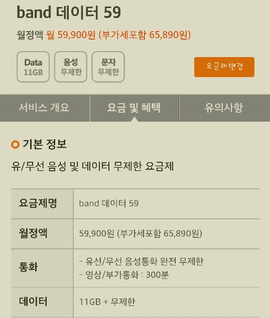 (현재 상황) 지금 밴드59 요금제. 부가세 포함 6만5890원. 데이터는 11기가.