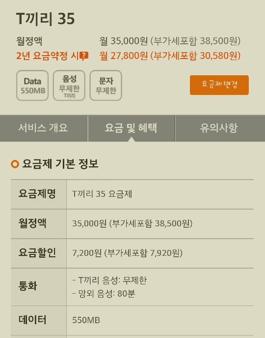 요금제를 변경 후 한 달이 되는 날, 다시 요금제를 바꿨다. 이번엔 LTE35 요금제로 바꿨다. 기본 데이터가 500메가였기 때문이었다. 200메가만 더 주어지고, 지인에게 1기가를 받으면 어떻게 알뜰하게 잘 써볼 수 있으리라 생각했다.