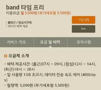 밴드 타임 프리. 월 5500원이면 출퇴근/점심 시간대에 데이터를 무제한으로 쓸 수 있다. 밴드29요금제와 결합해 놓으면 최상의 조합이라고 생각했다.