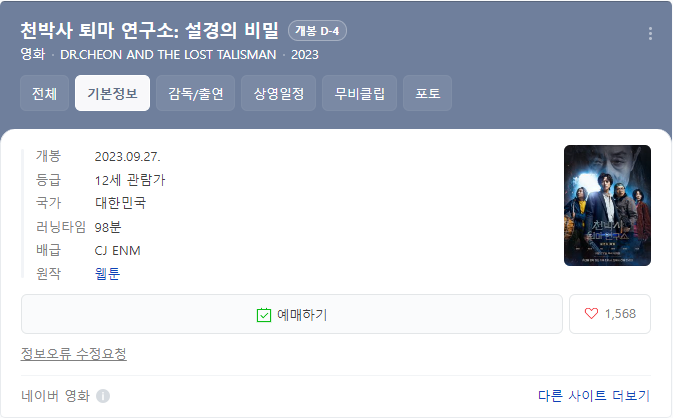 찾아보니 '천박사의 퇴마연구소'는 12세 관람가였다! 속으로 쾌재를 불렀다. 아들과 같이 볼 수 있는 영화여서다. 다음 주에는 '천박사의 퇴마연구소'를 보고 후기를 남겨야겠다.