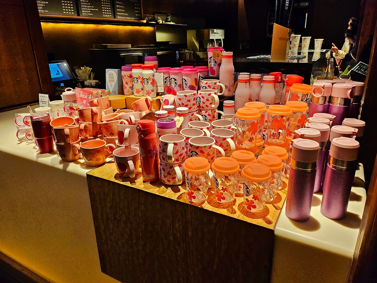 스타벅스가 특별한 지점이라는 말에 기념품으로 텀블러를 하나 사려고 했는데 모두 핑크핑크해서 도저히 살 수 없었다.