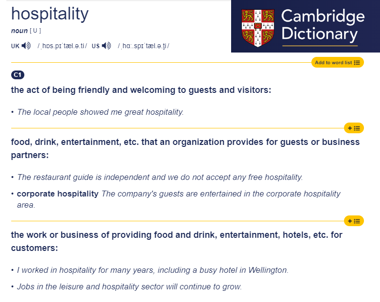 어릴 적 익혔던 단어인 'Hospital'이란 단어가 눈에 들어왔다. 분명 'Hospital'이란 단어는 병원이지만, 'Hospitality'가 되면, 의미가 여행자나 손님을 친절하게 접대하는 것을 의미한다. 음식과 음료, 놀이, 호텔 등을 사업 관점에서 제공하는 것도 포함된다.