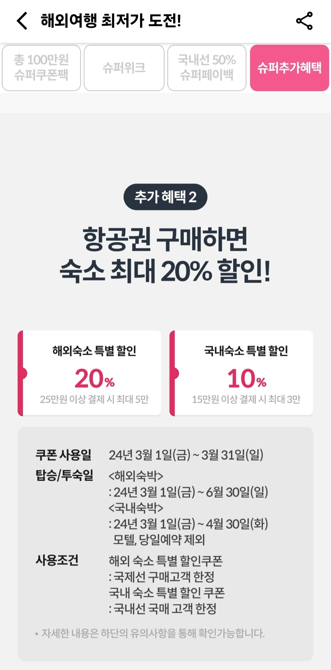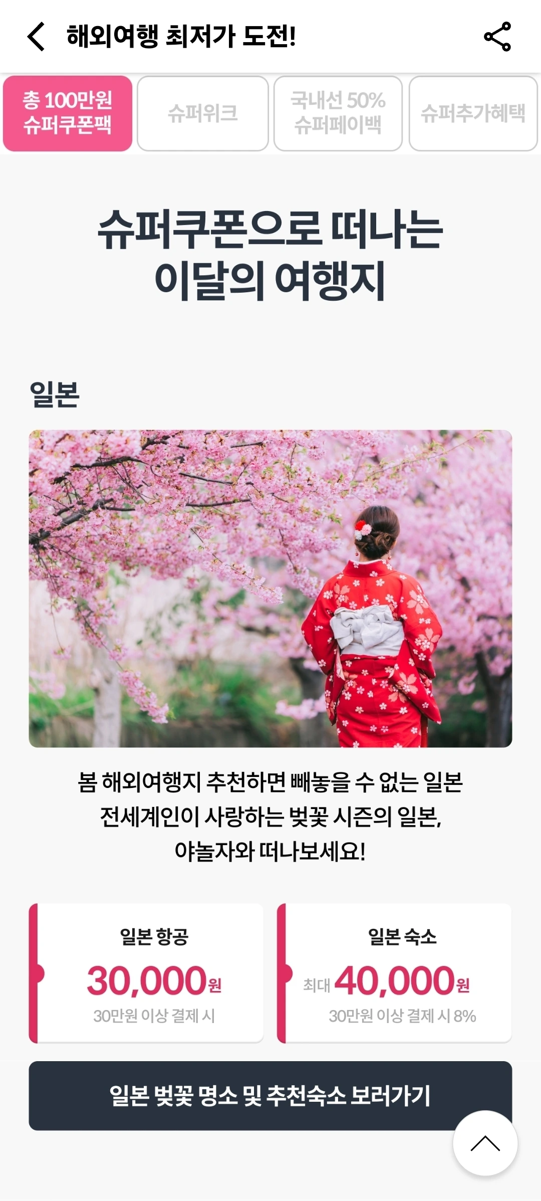 그러다 알게 됐다. 야놀자에 '슈퍼쿠폰팩'이란 게 있다는 것을! 우연히도 3월의 이달의 여행지가 일본이었다. 30만 원 이상 결제하면 항공료 3만 원, 숙소는 4만 원(최대) 할인받을 수 있다고 나와있었다.