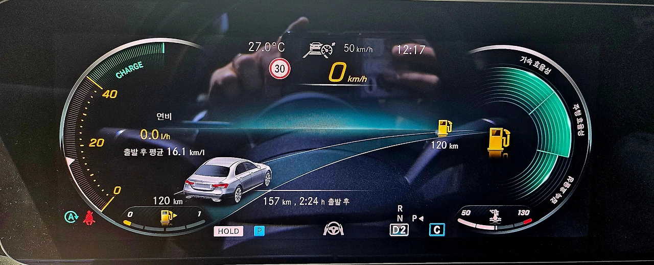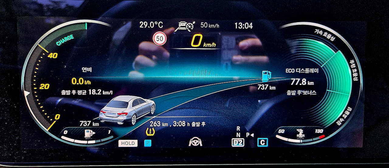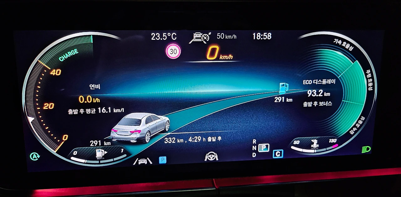 여담으로 말하자면, 벤츠 E250 익스클루시브는 가솔린 차량이지만 저공해 차량으로 나온 모델이다. 주행하다 브레이크를 밟으면 CHARGE(충전) 구간에 불이 들어온다. 충전 구간을 채워나가는 것이 E250 익스클루시브를 운전하는 즐거움이기도 하다.