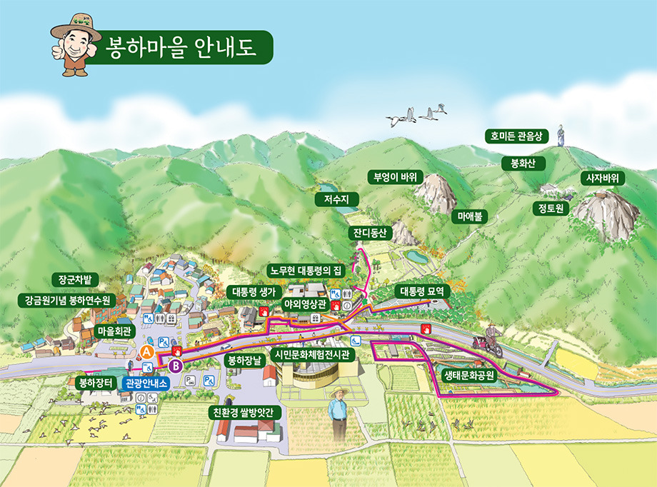 봉하마을이란 명칭은 봉화산 봉수대 아래에 있는 마을이라고 하여 지어진 이름이다. 대한민국 제16대 대통령인 故 노무현 전 대통령님의 출생지이기도 하다.
