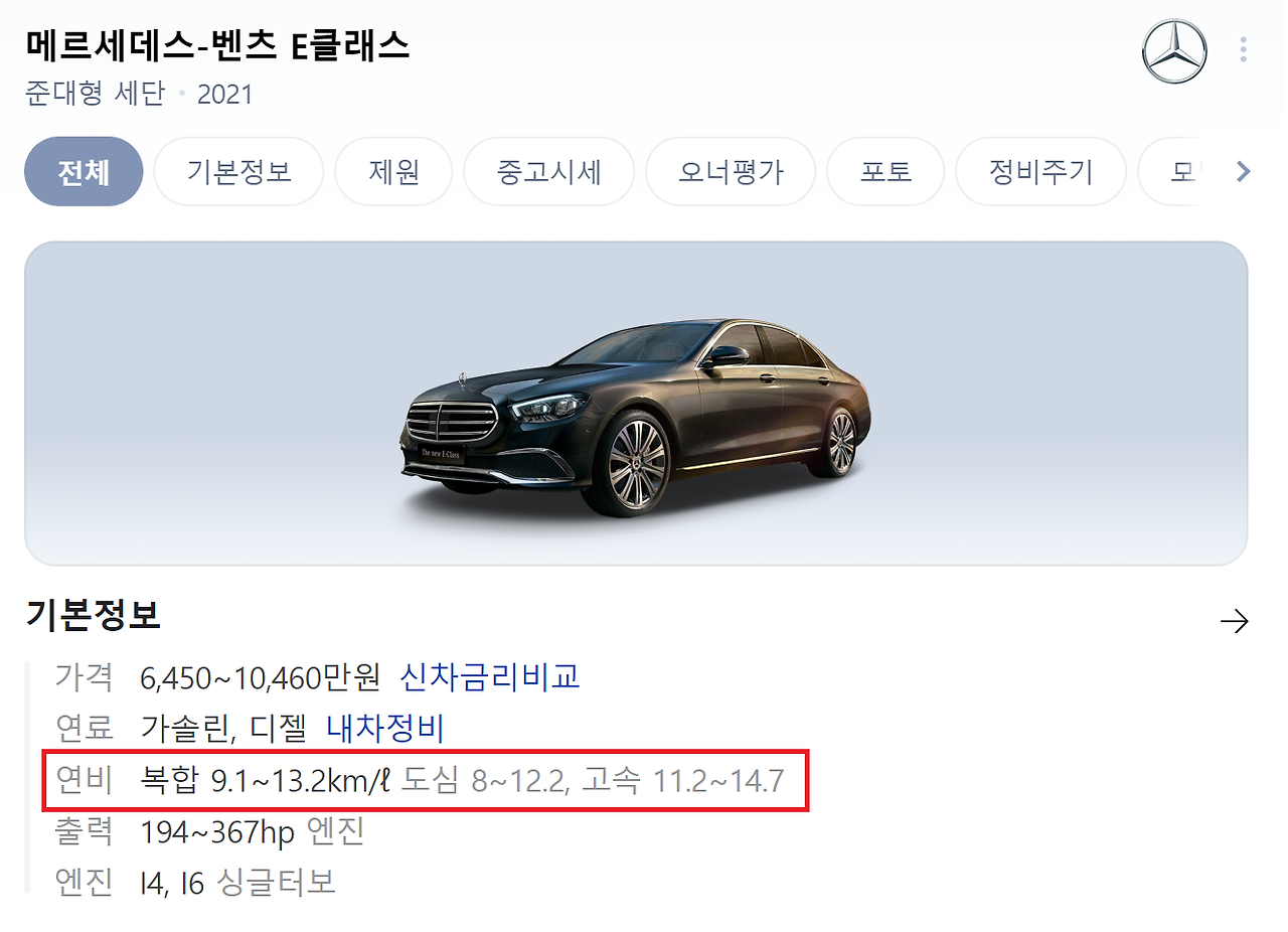네이버에서 차량 모델을 검색하면 딜러사에서 올려놓은 정보가 보이는데, 해당 정보에는 벤츠 E250 익스클루시브 공식연비(복합연비)는 최대 13.1km/l이다.