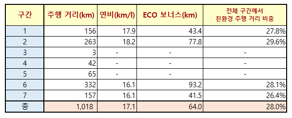 그러다 마지막에 도심 운전 속 신호등과 도로안전지대 속도 제한 등으로 서행 운전으로 연비보다는 안전운전에 신경 써야 했다.
