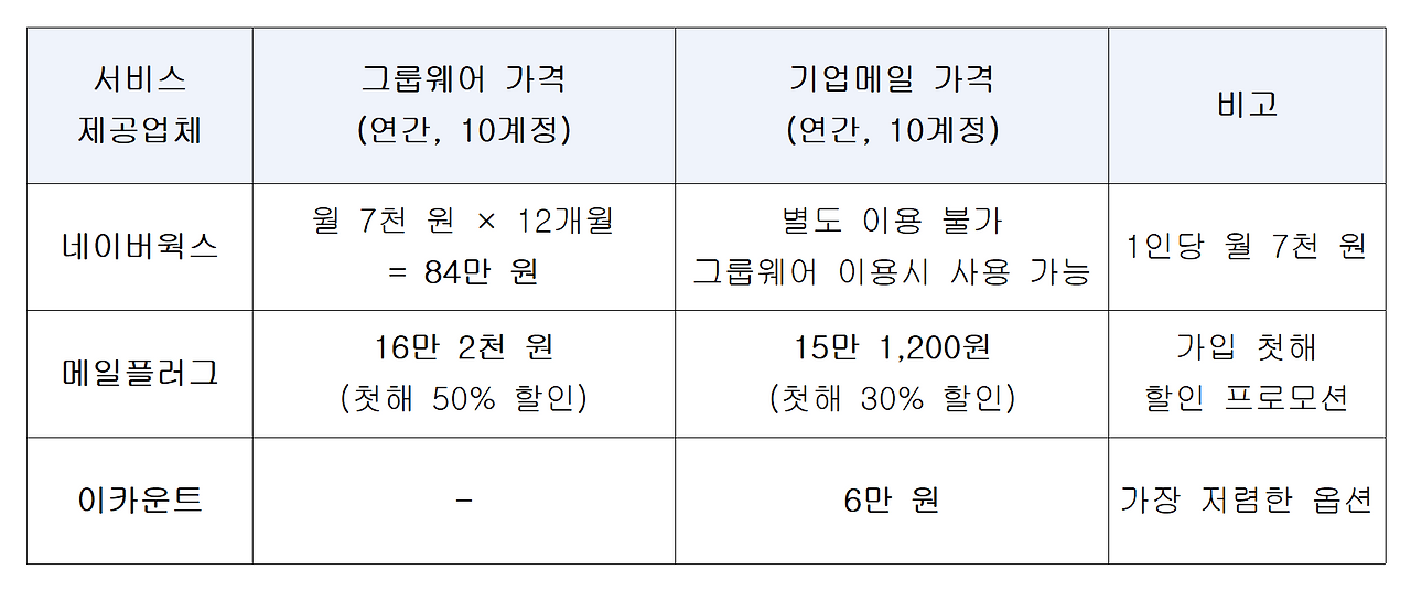 하지만 시간이 지나면서 착각이 걷히고 냉정한 현실이 보이기 시작했다. 그룹웨어의 다양한 기능이 있었지만, 정작 내가 사용하는 것은 거의 없었다. 회의록을 공유할 일도, 협업을 위한 프로젝트 게시판을 사용할 일도 많지 않았다. 내가 실질적으로 필요했던 것은 혹시 모를 이메일 계정 확장성과 안정적인 기업메일 서비스 정도였다.