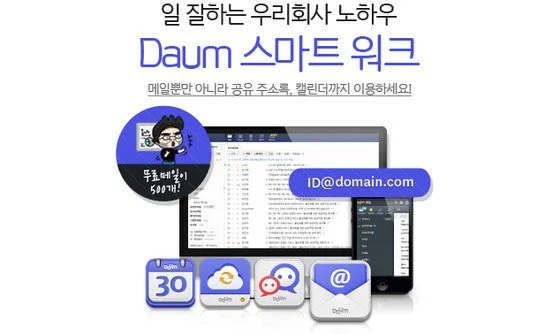 다음 스마트 워크 이용을 원하는 개인이나 기업은 전문 호스팅 업체에서 도메인을 생성한 후 신청 페이지(http://mail2.daum.net/hanmailex/domain.html)에 등록하면 된다. 이미 소유한 도메인이 있다면 새로 만들 필요 없이 바로 등록 가능하다. 신청 시 입력한 도메인으로 다음 스마트 워크 서비스에서 최대 500명까지 '개인ID@domain.com' 형태의 메일 계정을 생성∙이용할 수 있다.