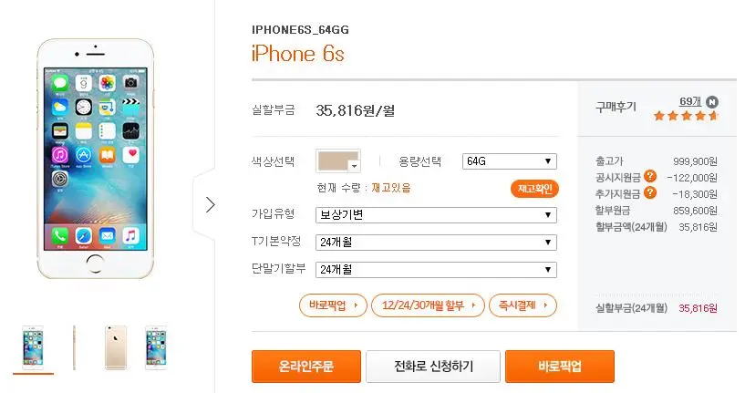 아이폰6s의 단말기 가격이 99만9900원에서 85만9600원으로 할인받은 것처럼 보인다.