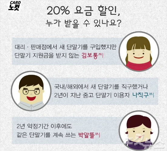 ▲대리점이나 판매점에서 새 단말기를 샀지만, 단말기 지원금을 받지 않고 20% 선택요금 할인제를 신청했거나 ▲국내 또는 해외에서 새 단말기를 직접 샀거나, 2년이 지난 중고 단말기를 구한 이용자 ▲2년 약정 기간이 지나 같은 단말기를 계속 쓰고자 하는 이용자 등이다.