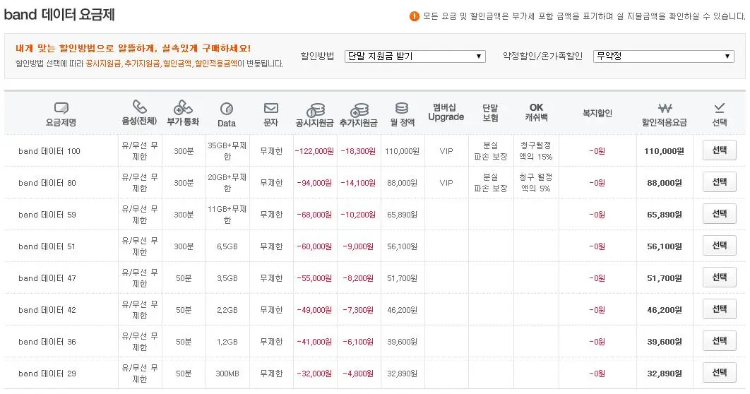 하지만 다음 페이지로 넘어가면 확인할 수 있다. 첫 페이지에 나온 공시지원금 12만2000원에 추가지원금 1만8300원 할인은 밴드 데이터 요금 100을 썼을 때 받을 수 있는 최대 할인가라는 것을!