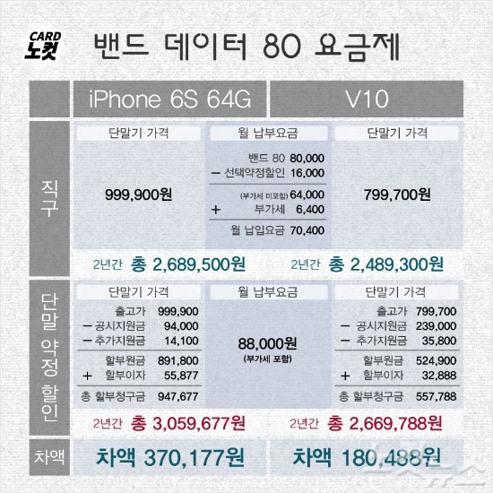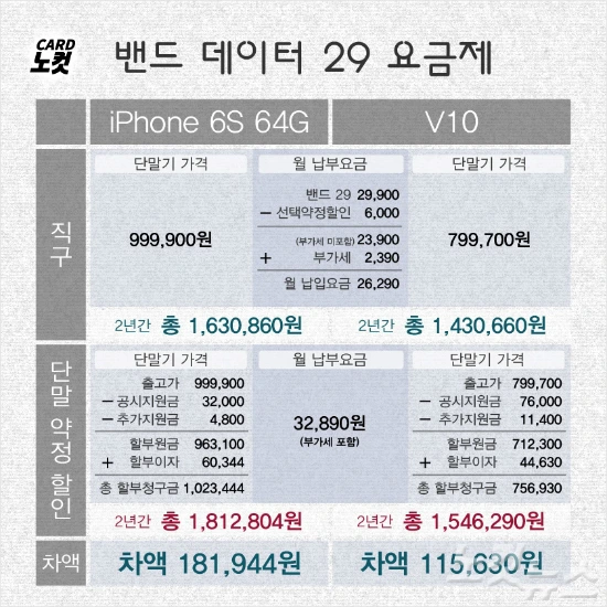 외산 휴대전화기의 대표 단말기인 애플 아이폰6S와 국내 제조사 LG전자 V10을 이 경우에 대입해 계산해봤다. 요금제는 편의상 밴드 데이터 29, 51, 80에 한정했다.(이미지 출처 : 노컷뉴스)