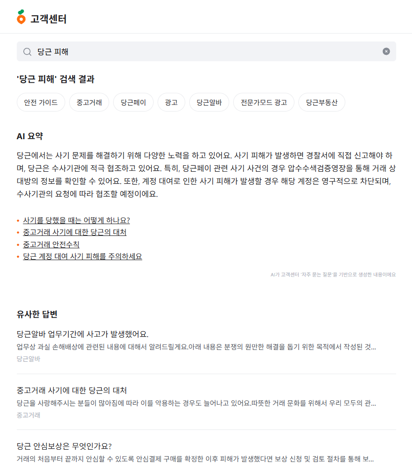 심지어 당근 고객센터에는 이에 대한 문의 항목조차 없었다. 앱에 탑재된 고객센터 AI는 당근 서비스 홍보만 반복한다.