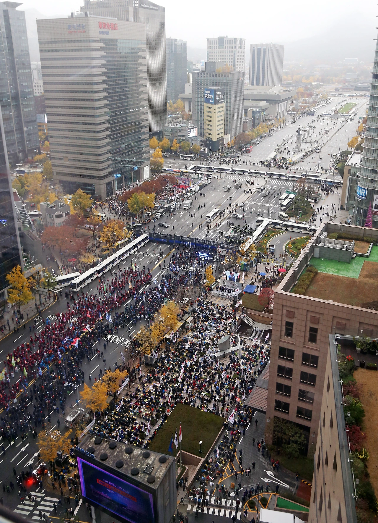 오후 2시쯤 도착한 광화문 광장. 시청 광장에는 시위대가, 광화문에 있는 코리아나 호텔에서부터는 경찰이 대치하고 있었다. 광화문 광장에는 청와대 방면으로 5중 차벽이 완성됐다. 시위대의 청와대 진입 시도를 원천 봉쇄하겠다는 경찰의 의지를 강하게 알 수 있는 대목이었다.