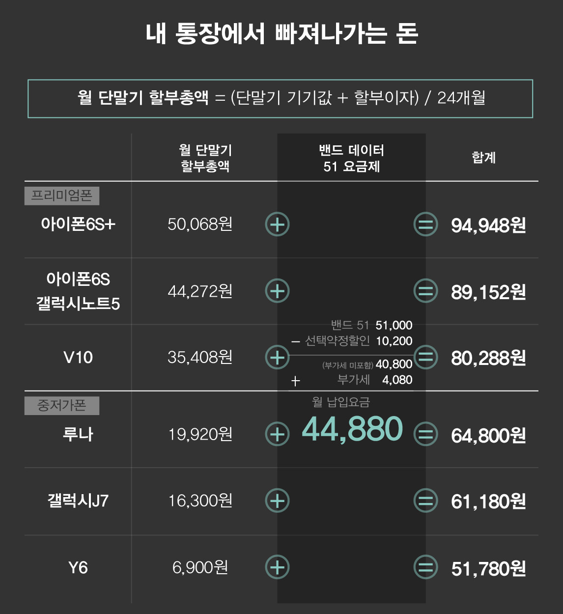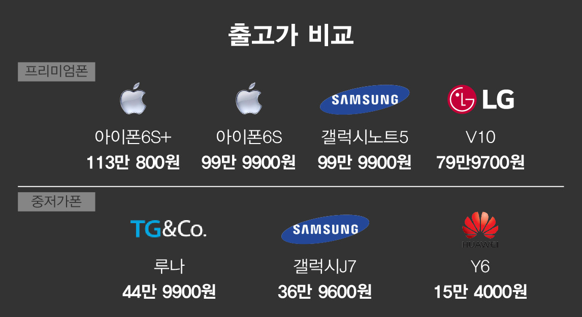 참고로 애플 아이폰의 최신 기종인 아이폰6S플러스는 100만원이 넘는 제품입니다. 프리미엄 폰과 중저가폰 차액은 적게는 35만원에서 최대 98만원까지 차이가 납니다. 이점을 염두하고 보시죠.
