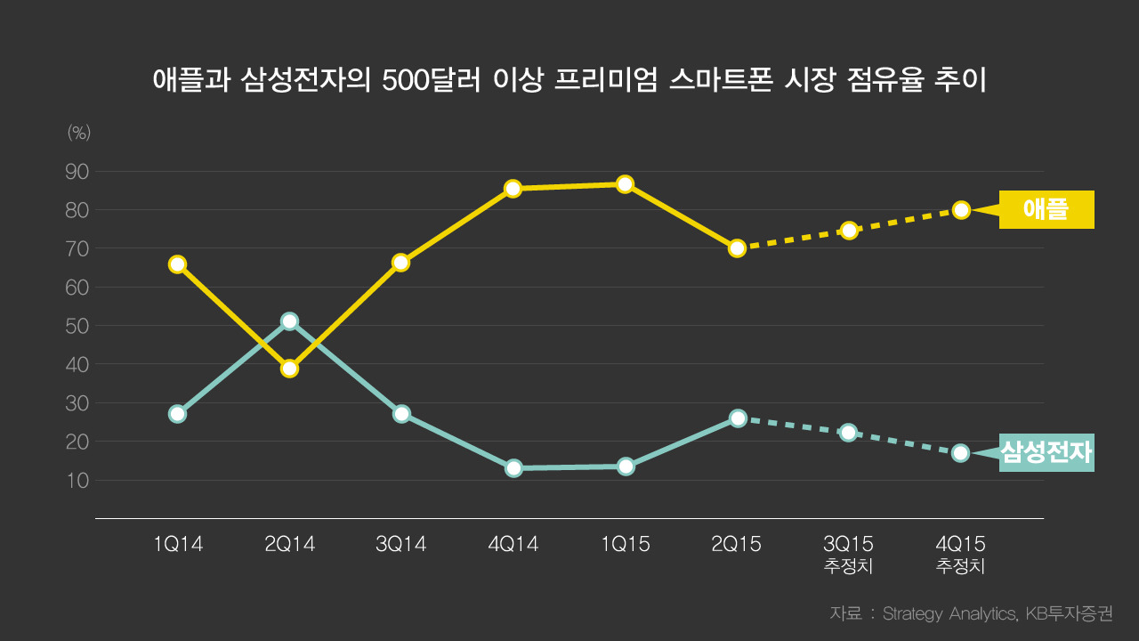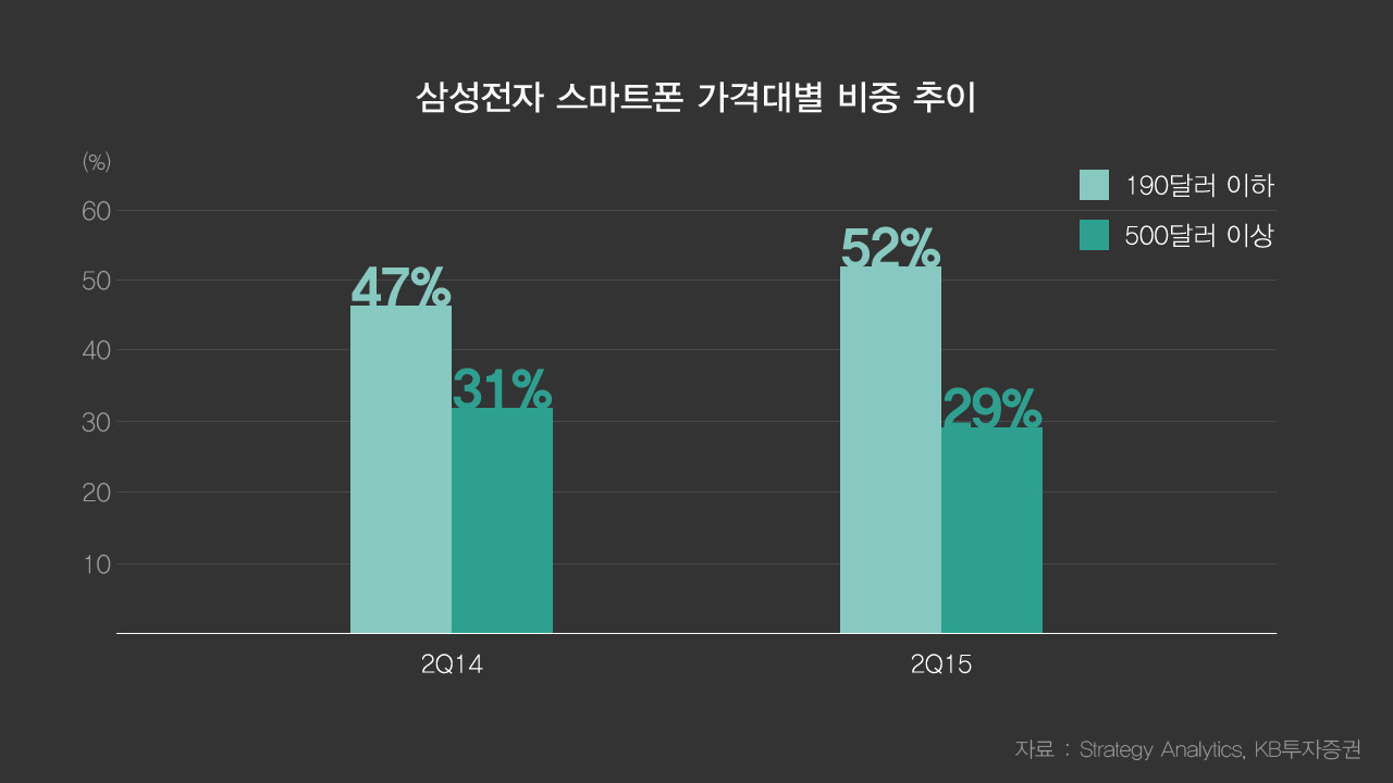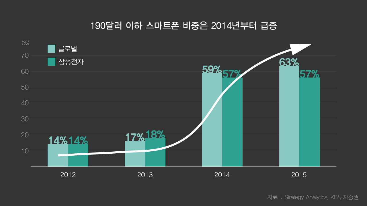 KB투자증권 김상표 연구원은 최근 낸 보고서에서 "190달러 이하의 스마트폰 비중은 샤오미, 화웨이 등 중국 업체들의 고속성장과 더불어 2014년에 59%까지 급증했고, 삼성전자 역시 190달러 이하의 스마트폰 비중이 57%까지 상승했다"고 지적했습니다.