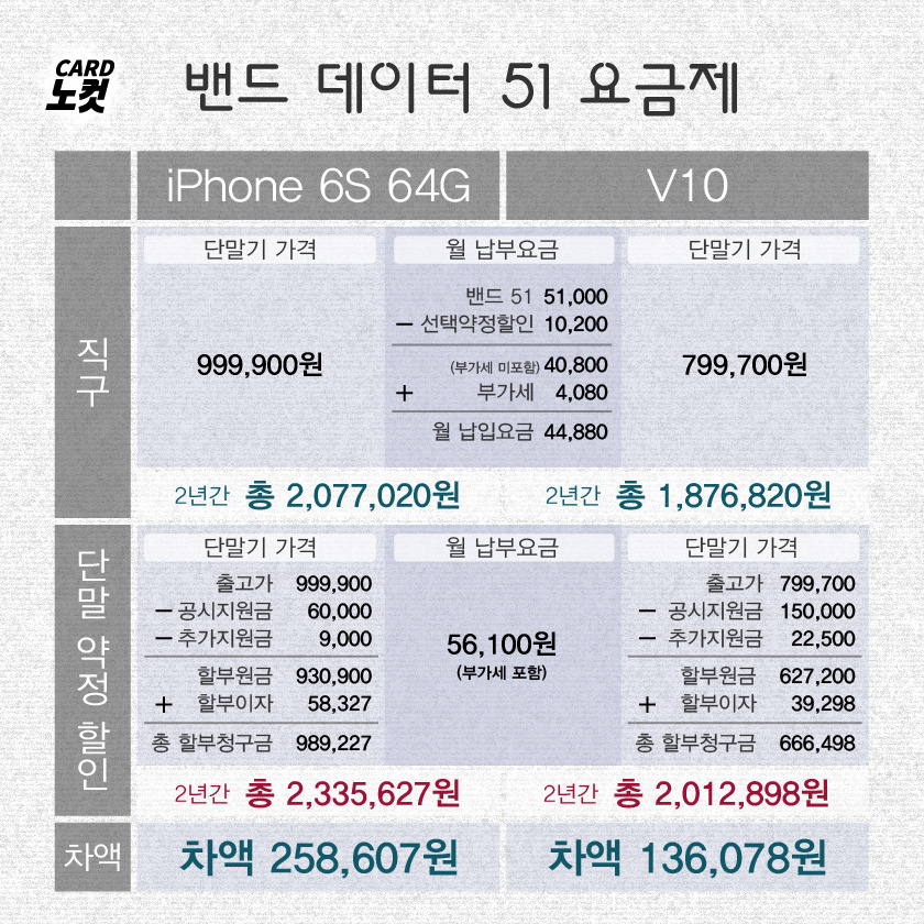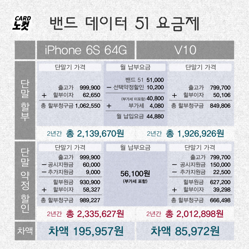 SK텔레콤 기준 51밴드 요금제, 그리고 거기에 '20% 요금할인'을 적용했을 때를 기준으로 정리했습니다. 이전에도 말씀드렸듯이 현재 단말기유통법 제도 하에서는 통신사에서 주는 단말 보조금을 받는 것보다 '20% 요금 할인'을 선택하는 것이 좋습니다.