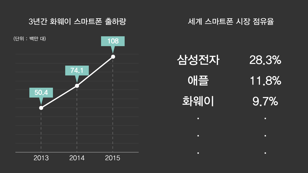글로벌 스마트폰 시장에서 급부상 하고 있는 제조사가 바로 화웨이입니다. 지난 한 해 동안 1억대 이상 스마트폰을 찍어내며 1억대 클럽에 가입했죠. 삼성과 애플을 제외하고 1억대 이상의 스마트폰 출하량을 달성한 곳은 화웨이가 처음입니다.