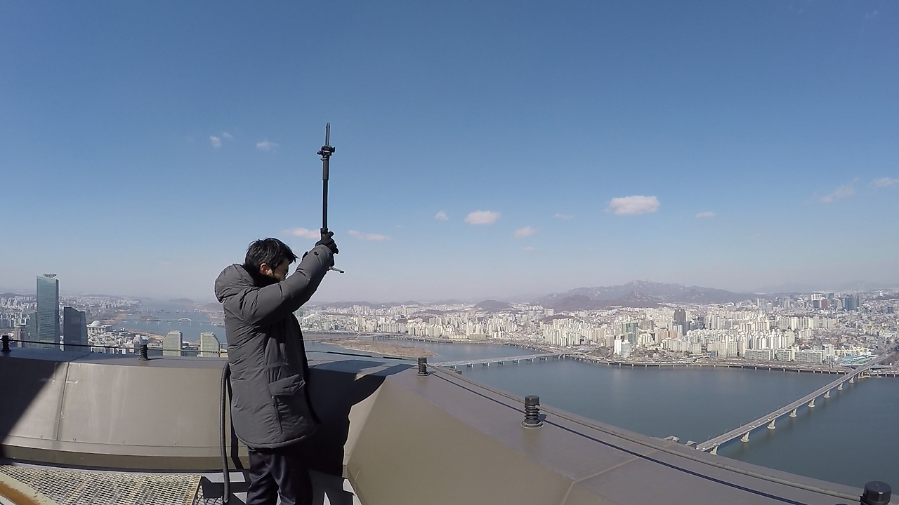 더 좋은 영상을 담기 위해 카메라를 긴 꼬챙이처럼 생긴 장비(봉)에 끼웠다. 63빌딩 밖으로 막대기 위에 올려져있는 360도 카메라가 바람이 불때마다 불안해 보였다. 강풍이라도 불면 단단히 묶어놨지만 떨어지는 것 아닌가라는 걱정에 3분을 촬영하는 내내 안절부절했다.