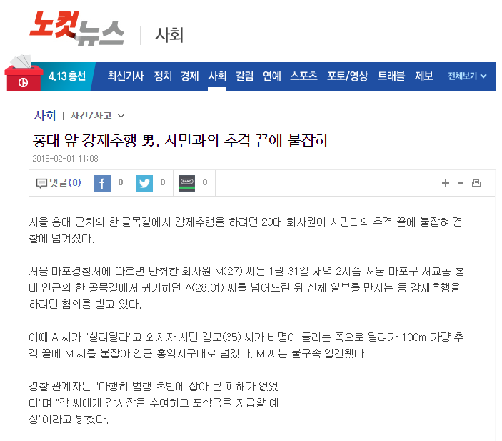 당시 난 사회부 기자였다. 내가 맡은 라인은 영등포 라인이었다. 이른 새벽 영등포 경찰서로 출근해 조간신문을 보고 있었다. 그러던 중 홍대 인근에서 성폭행 미수범이 잡혔다는 소식을 전해 들었다. 홍대는 마포라인이었다.