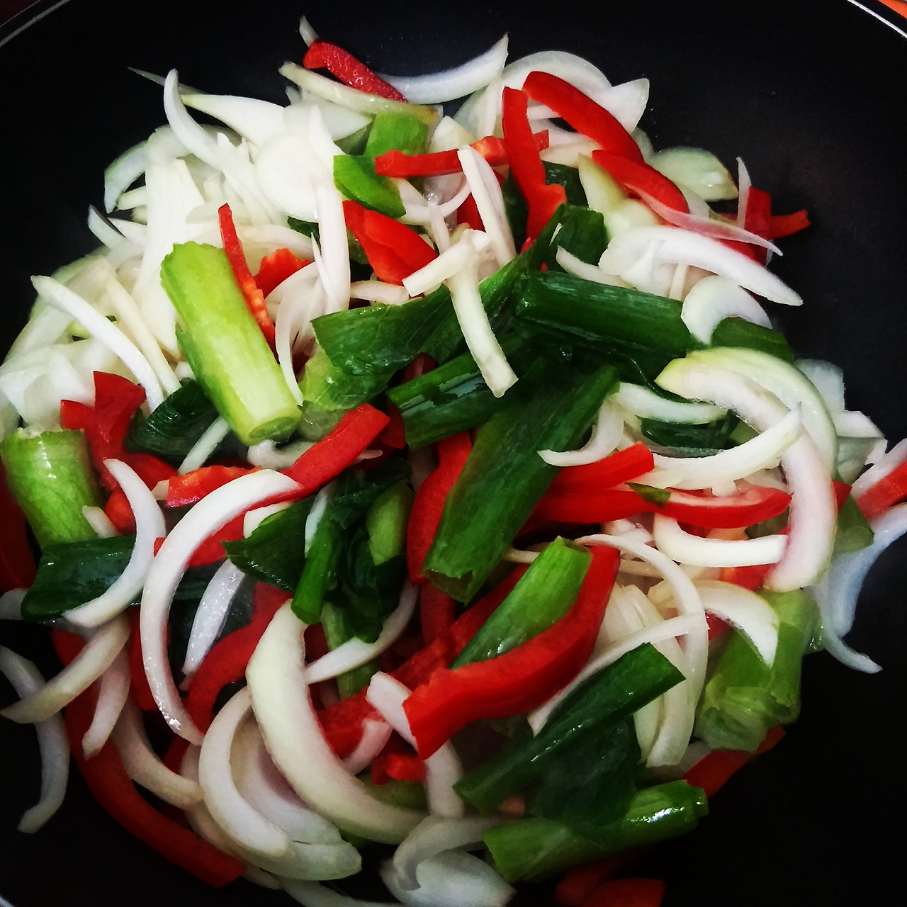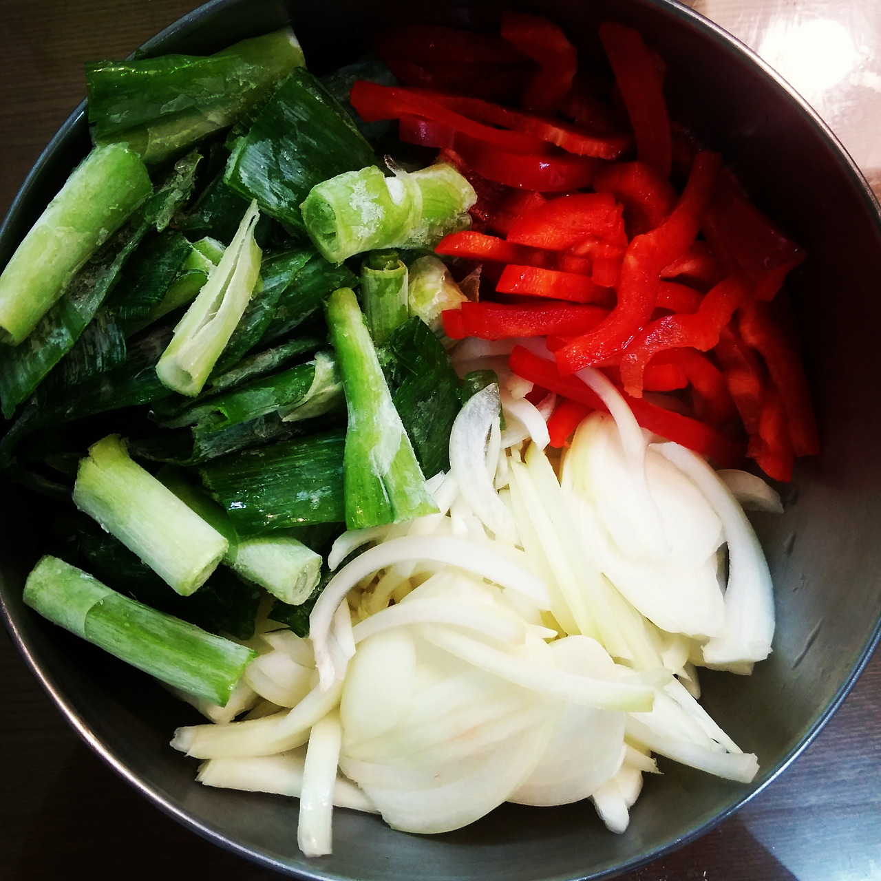 1. 양파와 피망, 대파를 준비한다. 성인 기준 2인분으로 양파 2개와 대파 6뿌리, 피망 1개가 적당하다.