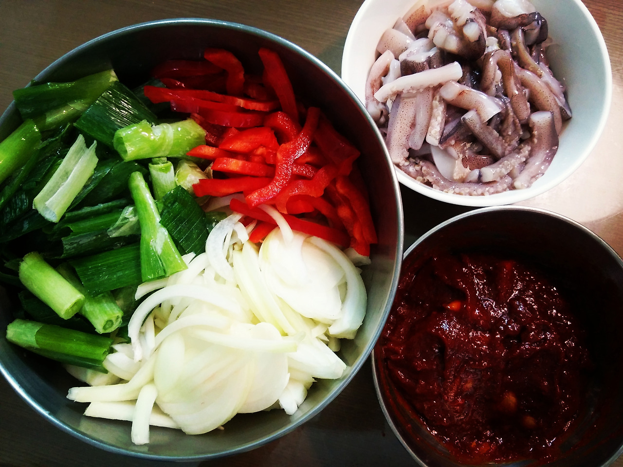 2. 오징어는 동네 마트에 가면 늘 2개를 묶어 판다. 가격은 우리 동네는 5500원이었다. 두 마리 중 내 경우엔 몸통 1개와 다리 2개를 넣었다. 나머지 몸통 한 개는 아들용 오징어볶음밥용으로 빼놨다.