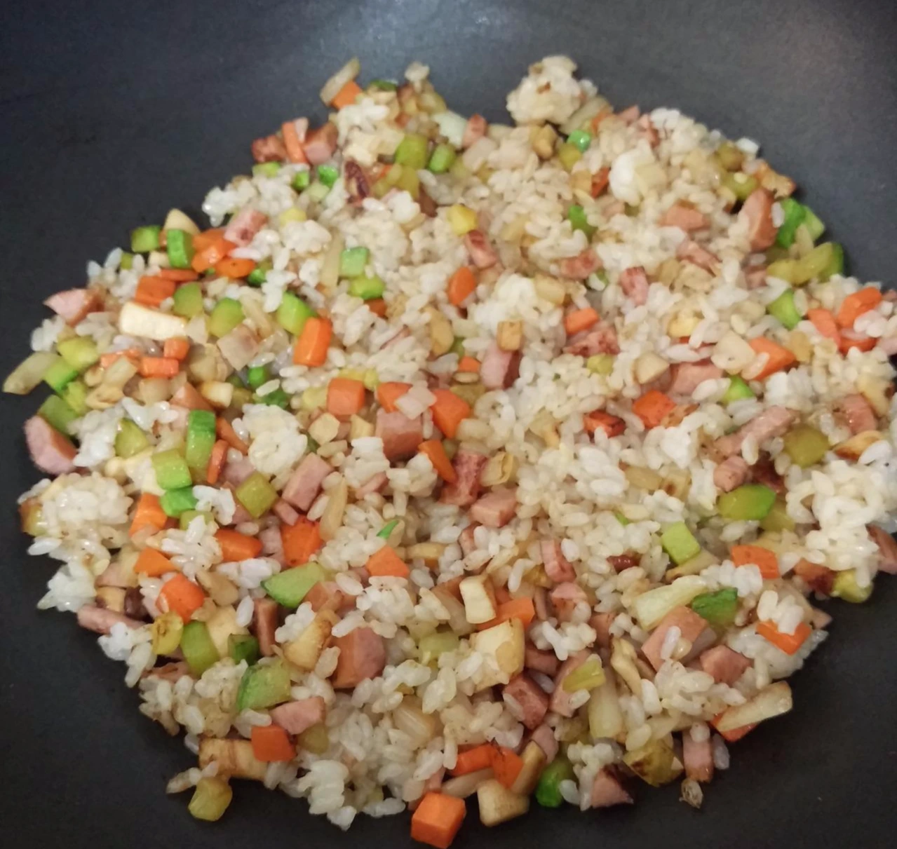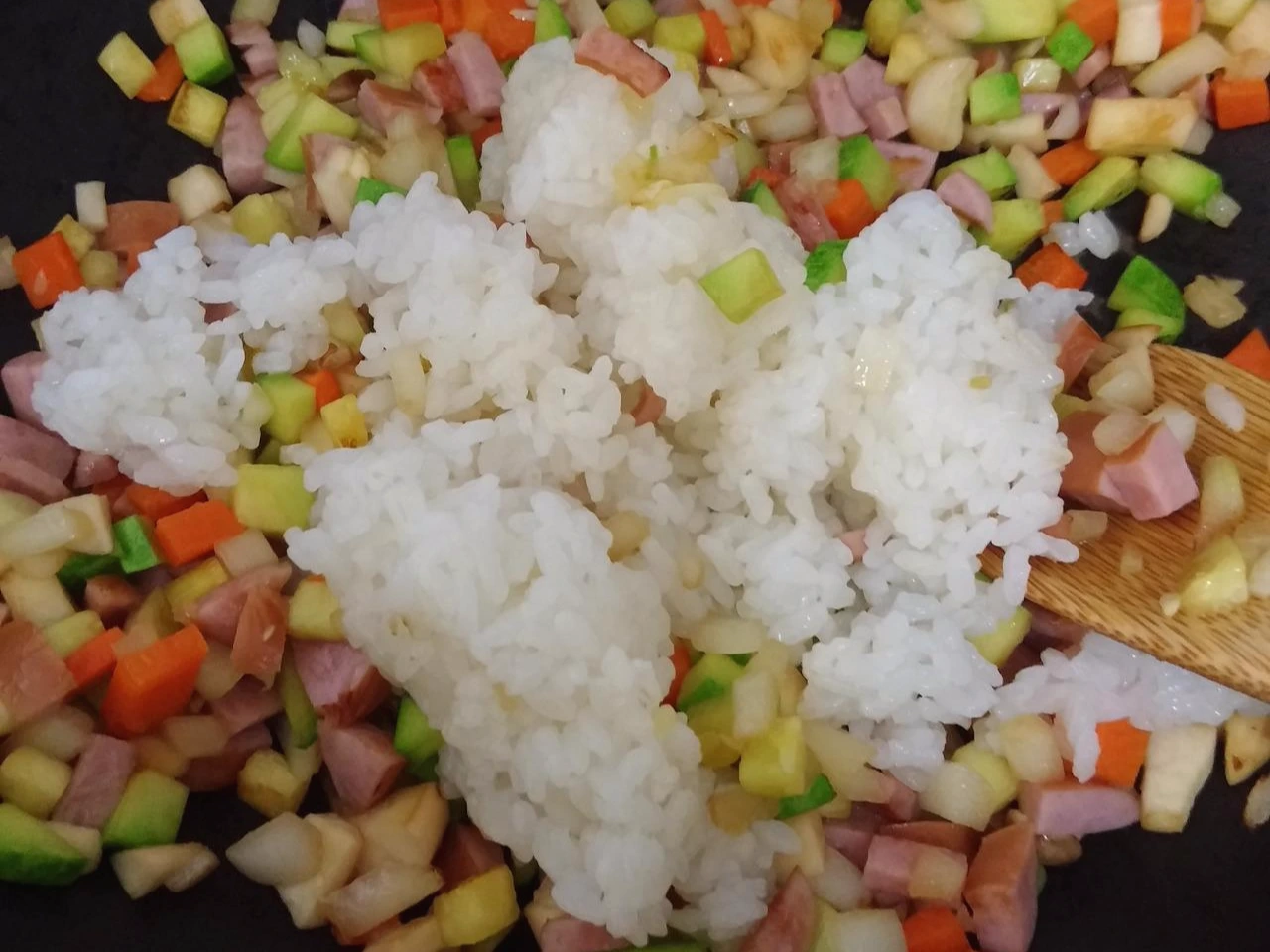 7. 당근이 익었다면 식은 밥을 넣고 볶는다. 밥과 재료가 잘 어우러지게 볶는 게 포인트.