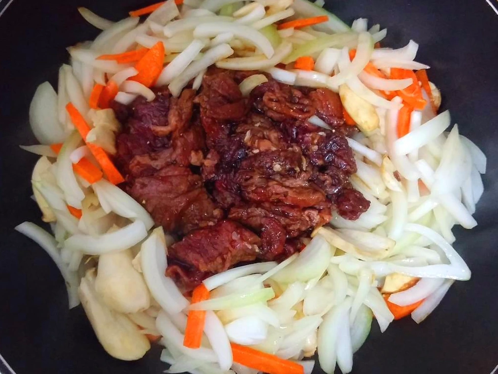 8. 새송이버섯과 당근을 넣고 볶다가 양념장과 고기를 투하한다.