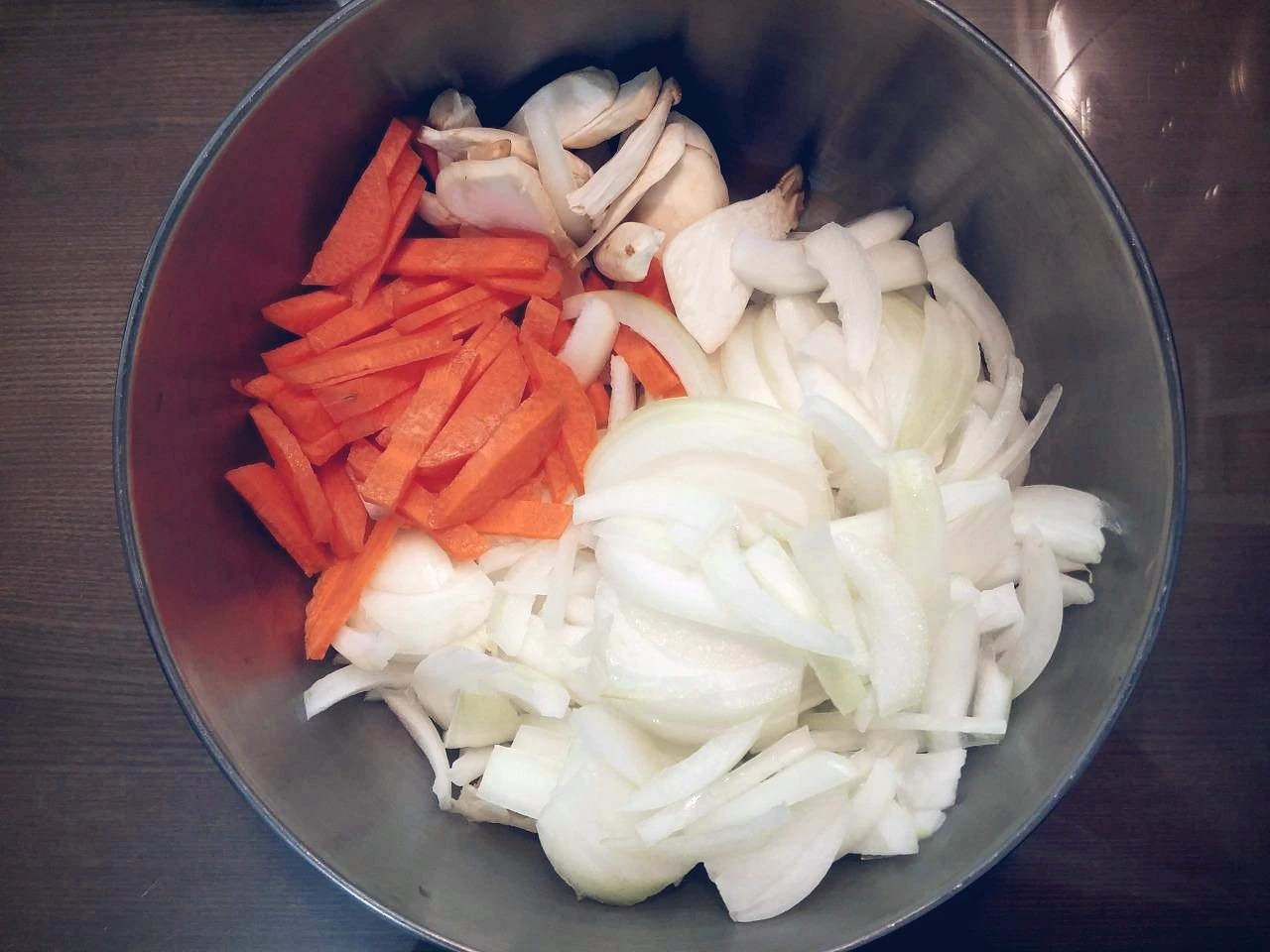 1. 양파 3개와 당근 1/2개, 새송이버섯 조금을 준비한다. 세로로 먹기 좋게 자른다.