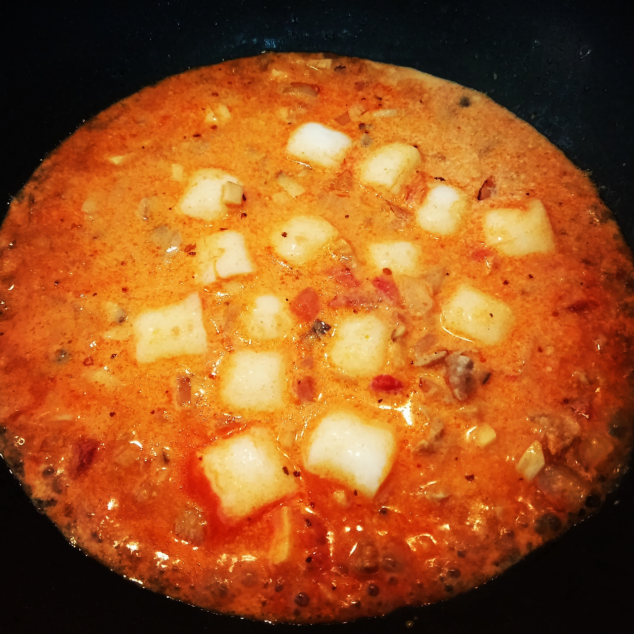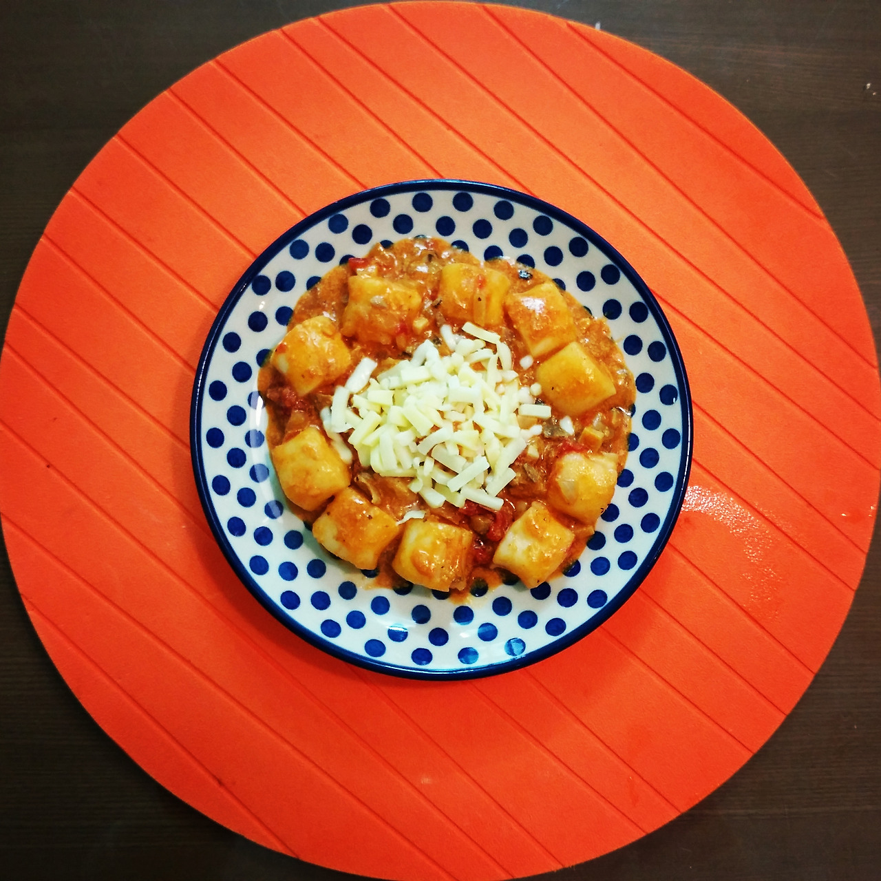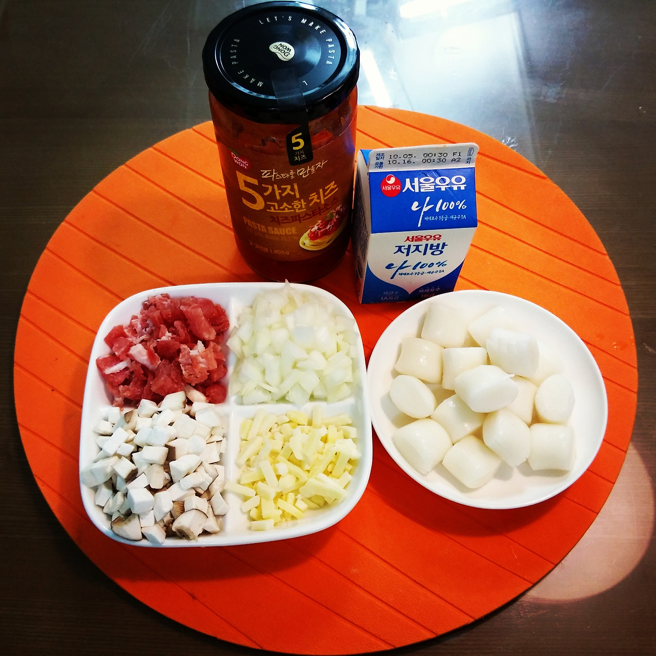 4. 토마토 치즈 파스타 소스를 두 숟가락, 우유 1개, 떡을 넣고 끓인다.(떡이 잠길 정도면 충분하다. 작은 프라이팬이라면 우유를 처음에 1/2~2/3도만 넣어도 된다)