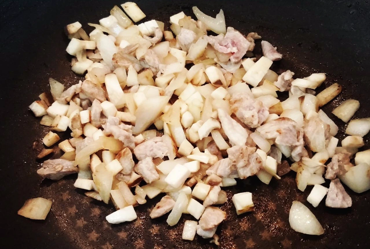 2. 양파가 투명해지면 돼지고기를 넣고 볶는다.