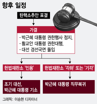 다만, 첫 탄핵 때 ‘소수의견’을 비공개했던 것과 달리 이번엔 모든 재판관이 자신의 결정 내용을 밝혀야 한다. 촛불민심을 의식할 수밖에 없다.
