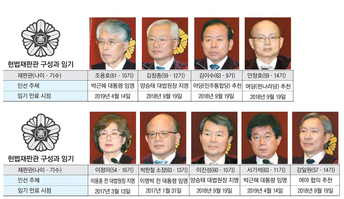 헌재 재판관들은 임명·지명·추천 등 인선 주체가 대통령·대법원장·국회 등 3명씩 분산돼 있다.