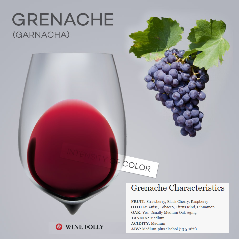 그르나슈는 딸기, 라즈베리와 같은 붉은과실향, 감초, 정향과 같은 향신료 향이 나는것이 특징이며 오크숙성하면 과실향이 약해지고 토피, 가죽, 동물성향이 발달하게 된다고 한다
